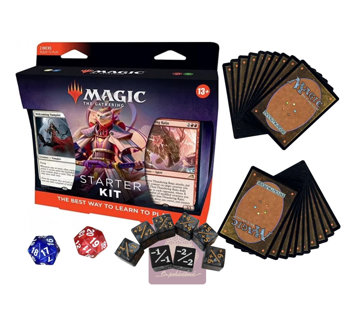 Startovní balíček Magic The Gathering (MTG)  umožní hrát 2 hráčům fantastickou karetní hru Magic: The Gathering  + NAVÍC je od Obce Pohádkové přidána sada pro hraní MTG užitečných herních kostek : 2 kostky d20 pro počitání životů hráčů a 8 kostek +x/+x  pro označení bonusů/ -x/-x pro označení postihů.