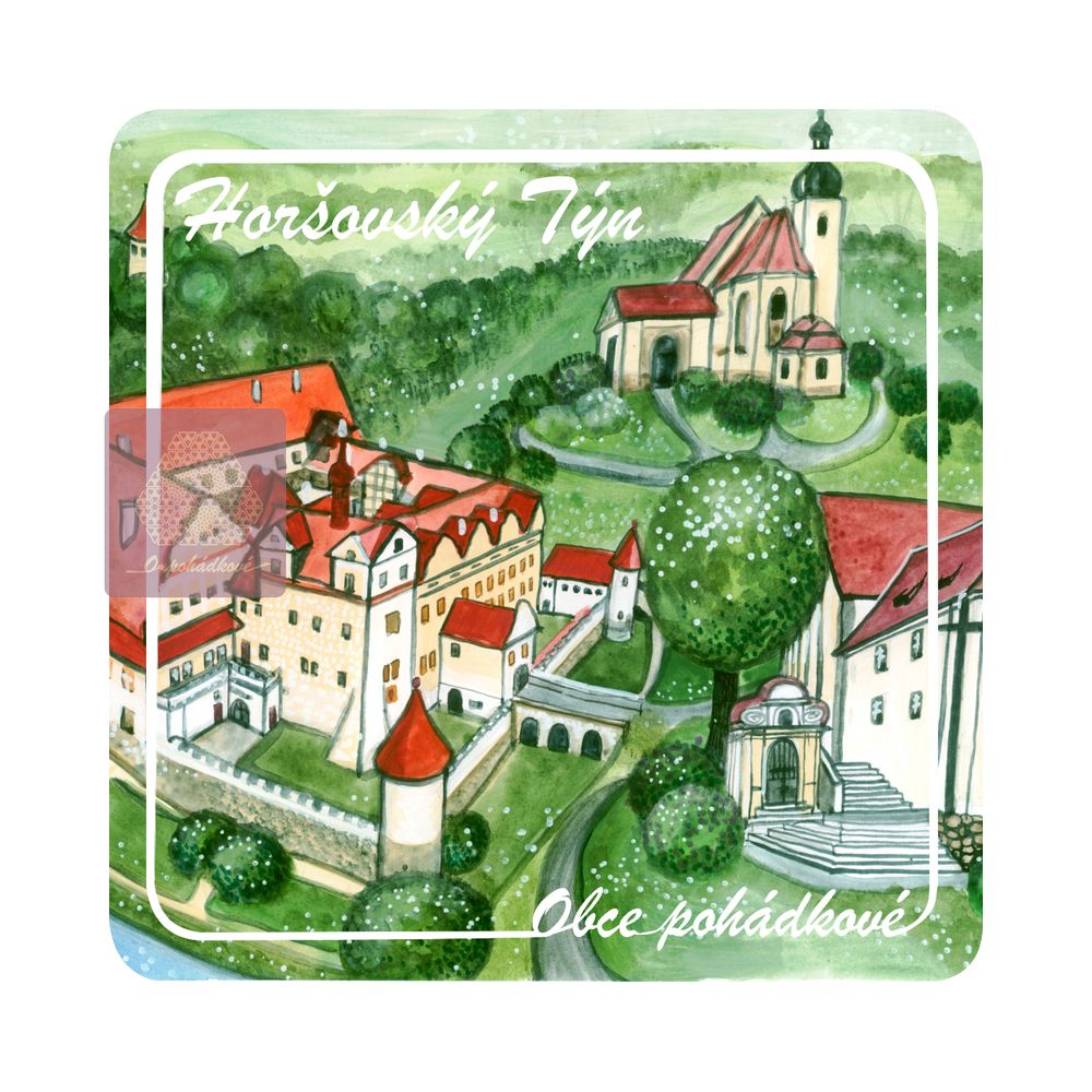 Exkluzivní sada nápojových podtácků 93 mm x 93 mm. Tácky z edice Obce Pohádkové tvoří ucelenou a stále doplňovanou sbírku s ilustrovanými motivy obcí z Čech.