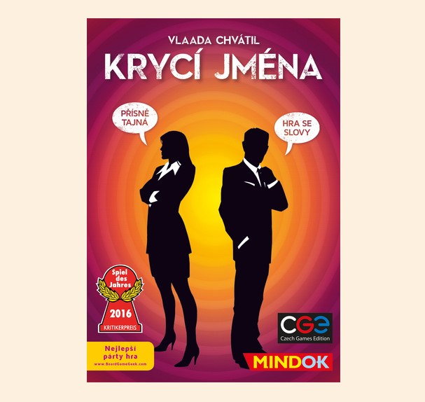 Původní česká hra autora Vlaadi Chvátila, která sbírá úspěchy po celém světě. Vítěz nejprestižnějšího světového ocenění Spiel des Jahres 2016 a dalších světových cen. Nejlepší párty hra historie dle celosvětové herní databáze Boardgamegeek.com. Hlavní špión řekne: Vlna 2. Najdete ta dvě správná slova, která vám pomohou k vítězství?   Skrytou identitu všech 25 agentů znají jen hlavní špióni. Ostatní hráči znají agenty pouze pod jejich KRYCÍMI JMÉNY. Týmy spolu soupeří o prvenství v úspěšném kontaktování všech svých agentů. Hlavní špióni předkládají jednoslovné indicie pro skupinu slov zobrazených na stole. Spoluhráči se pokoušejí uhodnout slova své barvy a vyhnout se slovům patřícím soupeři. Opravdový profesionál nikdy nekontaktuje nájemného vraha. KRYCÍ JMÉNA: skvělá zábava pro všechny, kdo si rádi hrají se slovy.