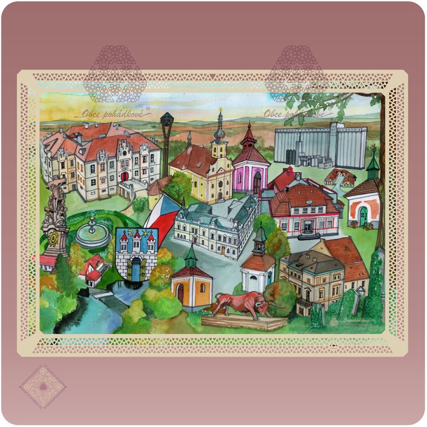 Originální malby z edice OBCE POHÁDKOVÉ® jsou ručně malované akvarely. Před vlastním namalováním byla pečlivě zpracována fotodokumentace malebným míst a objektů z ptačího pohledu. Z jednotlivých míst precizně poskládáná koláž pak vypovídá o útulnosti i krásách našich obcí.