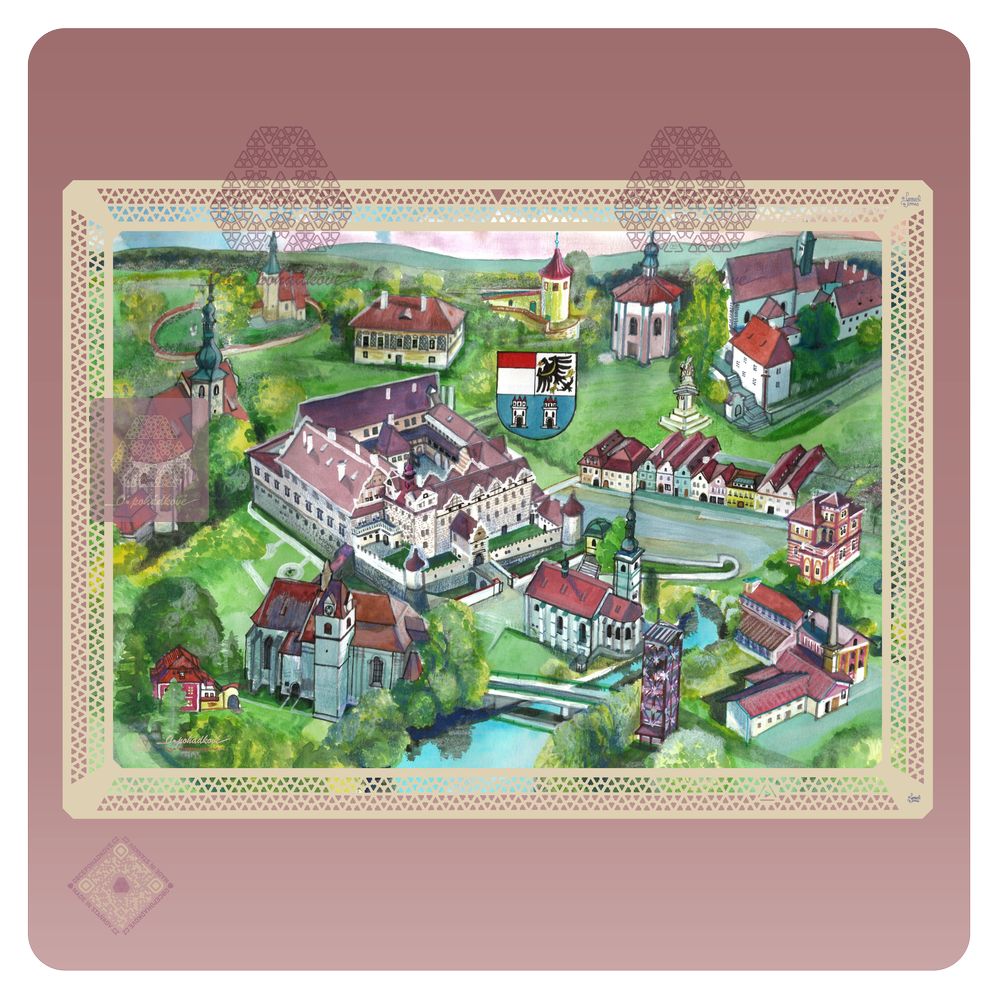 cz  psč 34601 české czechia čr plzeňsko kraj domažlicko hrad a zámek horšovský týn kostel sv. Anny kostel sv. Petra a Pavla  dárky upomínkové předměty ornamenty malba akvarel umění zelená modrá hnědá béžová doplňky stolování  kreativita obraz  krajina památky pamětihodnosti tradice  sběratelské suvenýry