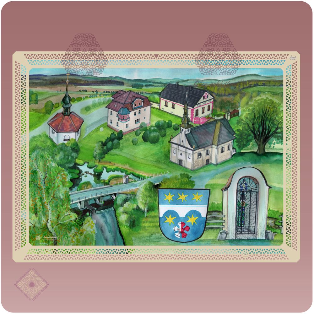 cz  psč 34601 kostel sv. Jana Křtitele výklenková kaple obecní úřad  most Radbuza domažlicko  dárky upomínkové předměty ornamenty malba akvarel umění zelená modrá hnědá béžová doplňky stolování  kreativita obraz  krajina Bohemiaris