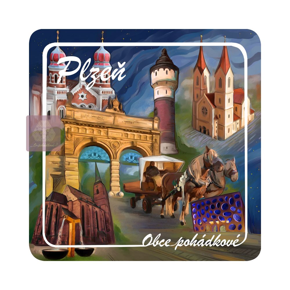 Exkluzivní sada nápojových podtácků 93 mm x 93 mm. Tácky z edice Obce Pohádkové tvoří ucelenou a stále doplňovanou sbírku s ilustrovanými motivy obcí z Čech.