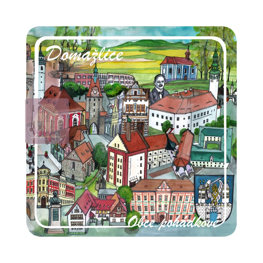 Exkluzivní sada nápojových podtácků 93 mm x 93 mm. Tácky z edice Obce Pohádkové tvoří ucelenou a stále doplňovanou sbírku s ilustrovanými motivy obcí z Čech.
