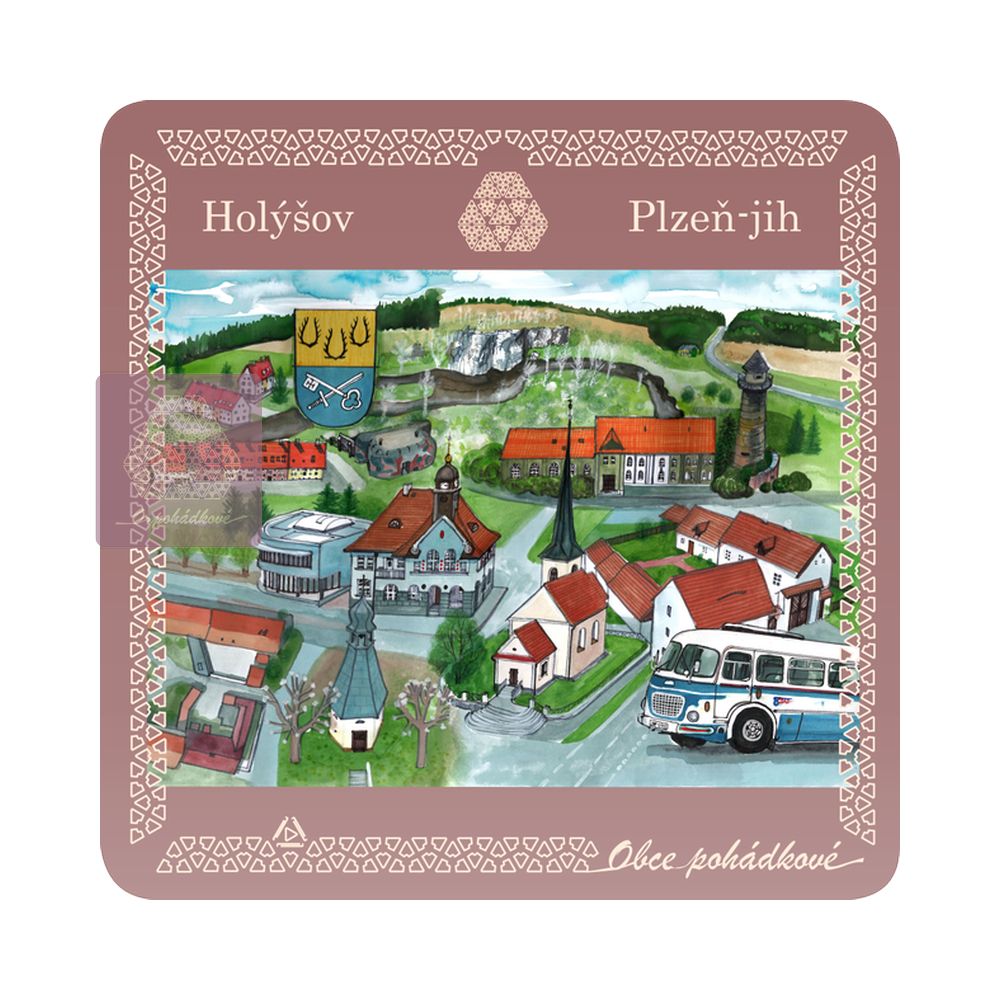 Exkluzivní sada nápojových podtácků 93 mm x 93 mm. Tácky z edice Obce Pohádkové tvoří ucelenou a stále doplňovanou sbírku s ilustrovanými motivy obcí z Čech.