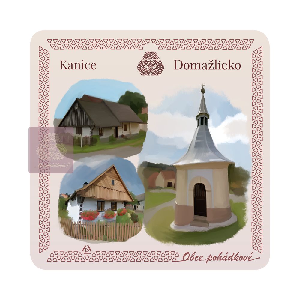 Exkluzivní sada nápojových podtácků 93 mm x 93 mm. Tácky z edice Obce Pohádkové tvoří ucelenou a stále doplňovanou sbírku s ilustrovanými motivy obcí z Čech.
