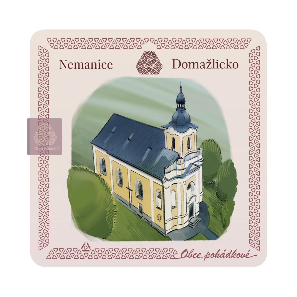 Exkluzivní sada nápojových podtácků 93 mm x 93 mm. Tácky z edice Obce Pohádkové tvoří ucelenou a stále doplňovanou sbírku s ilustrovanými motivy obcí z Čech.