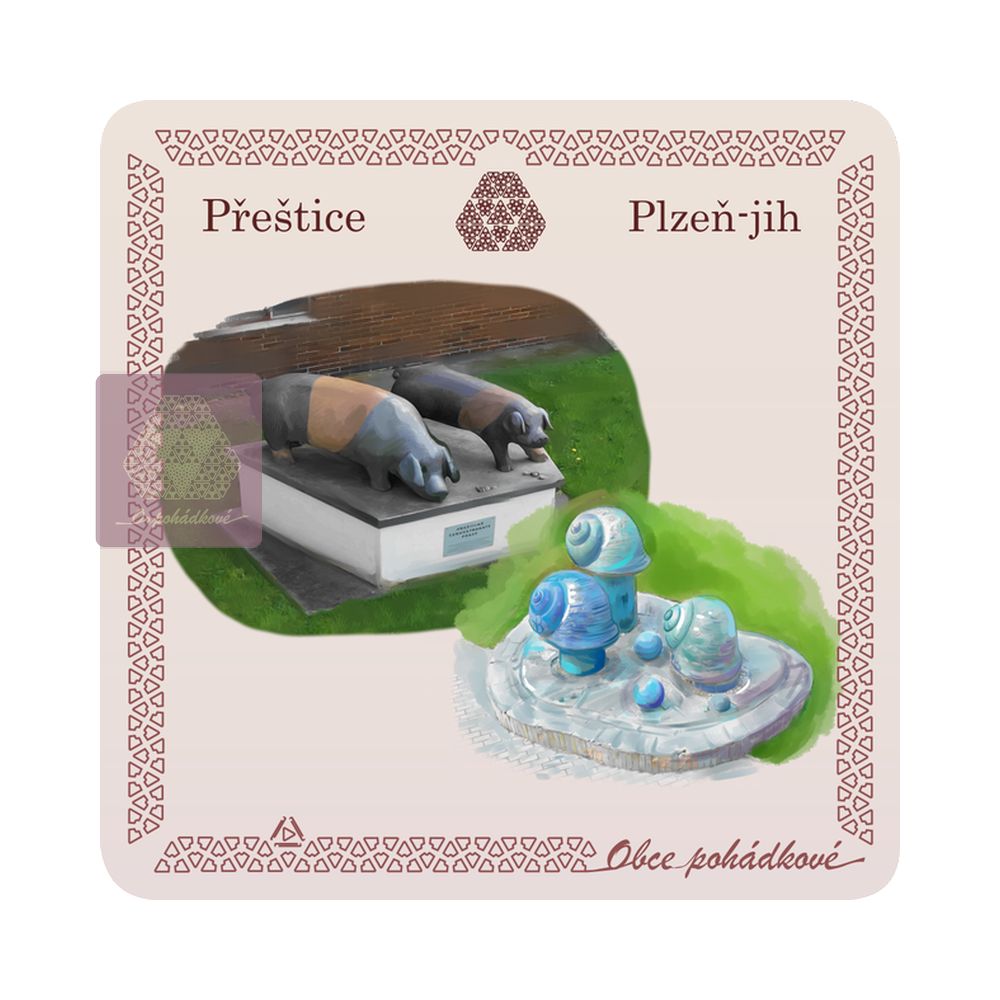 Exkluzivní sada nápojových podtácků 93 mm x 93 mm. Tácky z edice Obce Pohádkové tvoří ucelenou a stále doplňovanou sbírku s ilustrovanými motivy obcí z Čech.