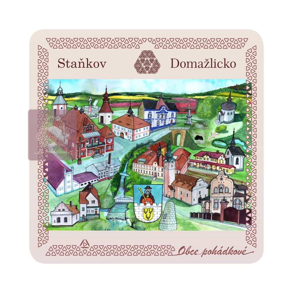 Exkluzivní sada nápojových podtácků 93 mm x 93 mm. Tácky z edice Obce Pohádkové tvoří ucelenou a stále doplňovanou sbírku s ilustrovanými motivy obcí z Čech.