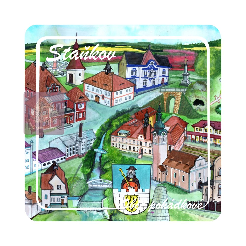 Exkluzivní sada nápojových podtácků 93 mm x 93 mm. Tácky z edice Obce Pohádkové tvoří ucelenou a stále doplňovanou sbírku s ilustrovanými motivy obcí z Čech.
